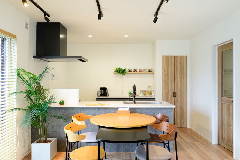 家族との会話も弾むオープンキッチン。近くに収納もありますので日用品のストックに。