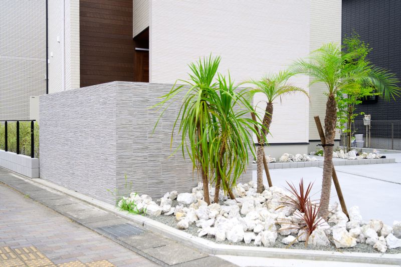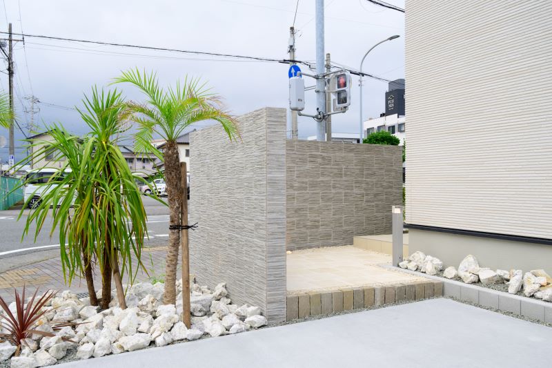 爽やかな南国風の外構。玄関ドア周辺は外部から見えづらいので防犯面でも安心です。