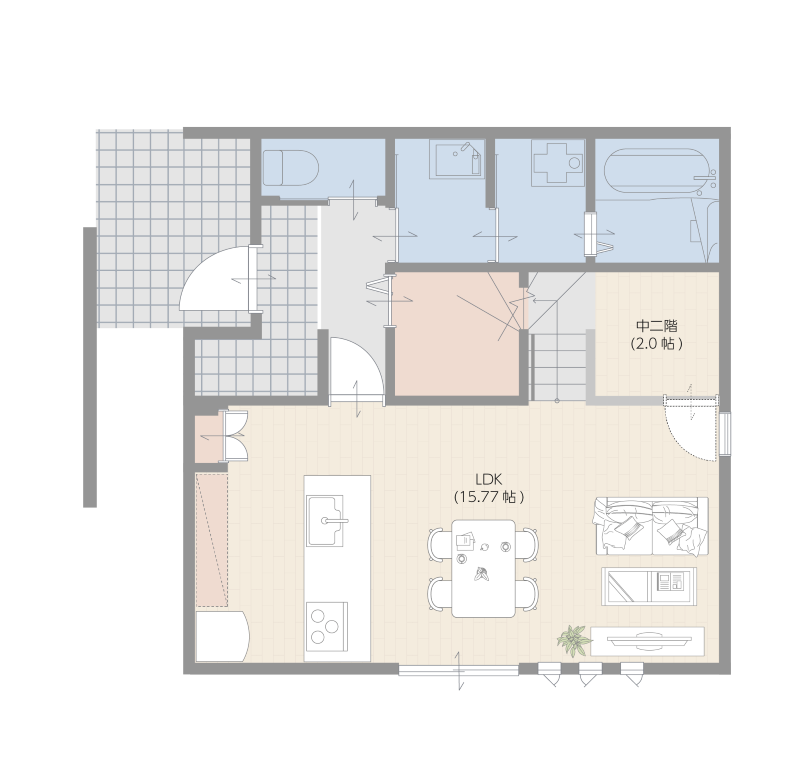 光が入り明るい中二階は、お子様のワークスペースやテレワークの場所としても最適。